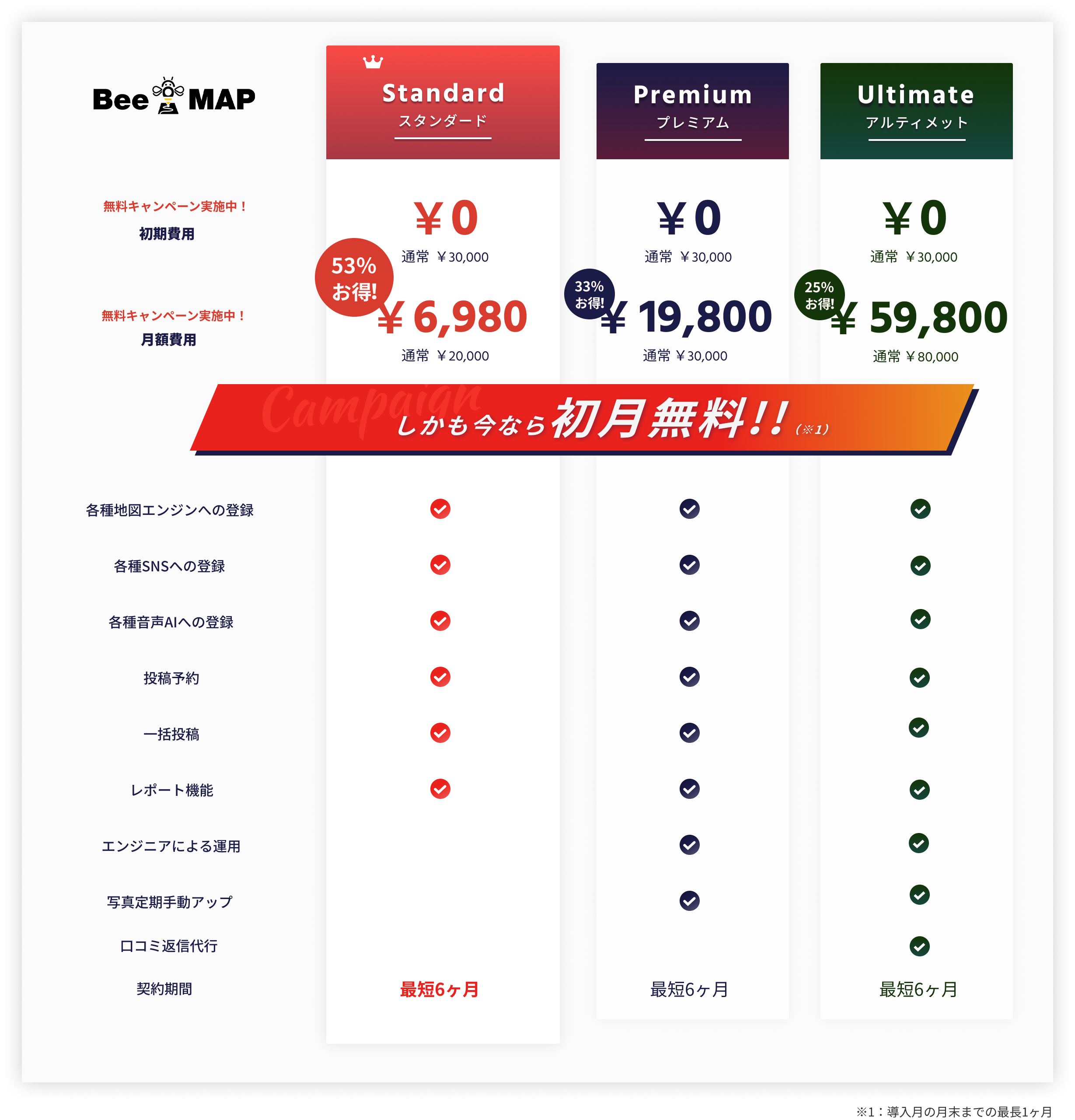ポータルサイトを利用する場合、月額数万円~数十万円の予算が必要になりますが、BeeMAPなら1日ワンコイン(月額15,000円)でご利用いただけます。しかも、キャンペーン中なら1日あたり約240円(月額6,980円)~。