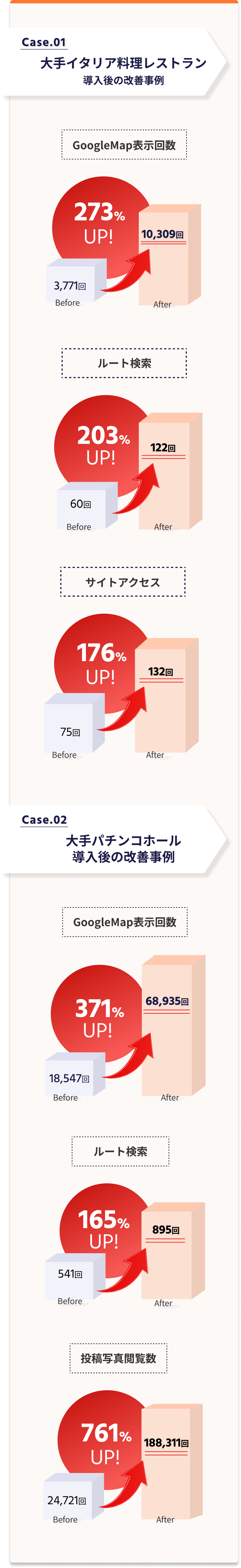 BeeMAPはGoogleビジネスプロフィール(旧Googleマイビジネス)を中心に AppleMapなどの地図エンジン、FacebookなどのSNSへ 同じ店舗情報を連携します。 Web上の店舗情報を一元化することにより優れたMEOおよびSEO効果を発揮し、 下記のように様々な業種でも、具体的な成果をあげています。